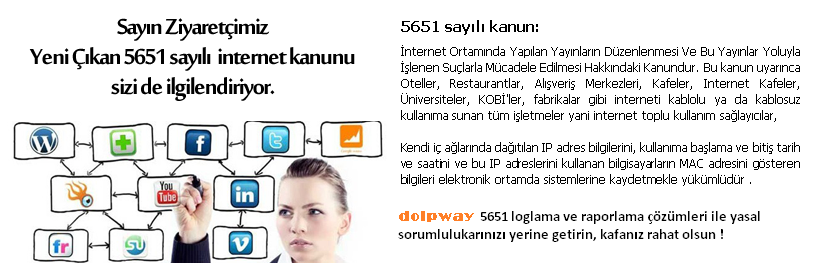 dolpway ;kurulumlarda internet erişiminin güvenli, sorunsuz,hızlı, en önemlisi yasalara uygun bir biçimde kullanılmasını sağlayan ve bilgisayar ağınızı dış ve iç etkenlerden koruyan ağ güvenlik sistemidir.
