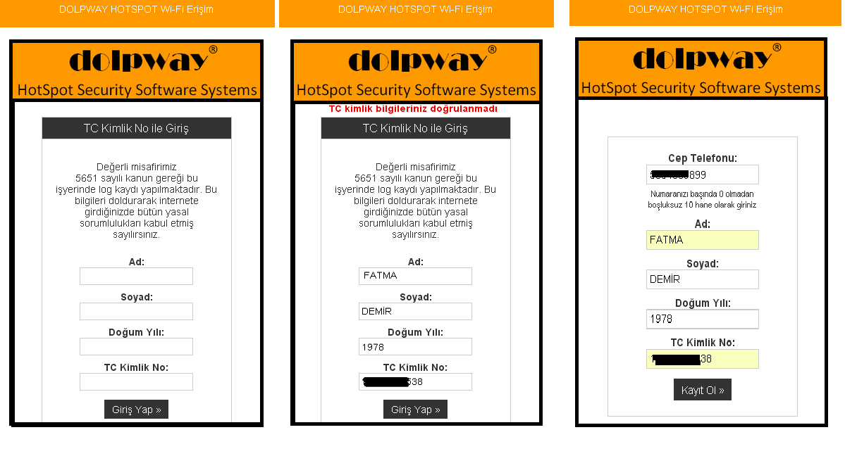 T.C. kimlik doğrulamalı hotspot internet sistemi ile müşterileriniz internete tc kimlik bilgilerini girerek giriş yapabilirler. Sistem nüfus kimlik idaresinden online tc kimlik doğrulaması yaparak çalışır. Kişi tc kimlik bilgilerini doğru giriş yaparsa internete giriş yapabilir. Bu sistemle beraber aynı anda sms li hotspotta aynı anda kullanılabilir. Kişinin tc kimlik bilgileri doğrulanırsa yazdığı cep numarasına kullanıcının gireceği şifre sms olarak gönderilebilir.